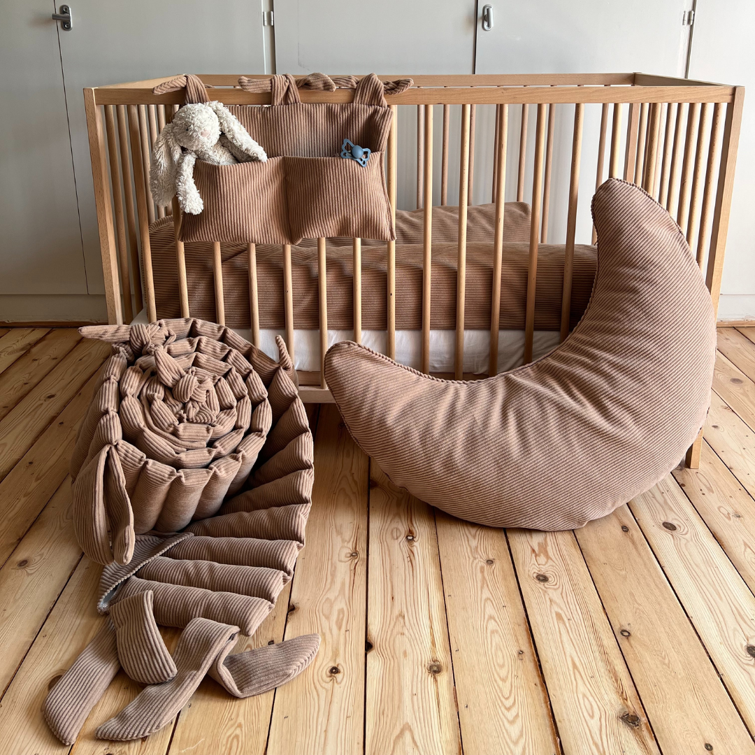 Vores unikke og multifunktionelle sengeslange er blevet en sand bestseller blandt tumlingeforældre! Bunden af natursten i hele sengeslangens længde sikrer, at den ligger stabilt, så det lille barn kan sove trygt og roligt i sin rede, mens fyldet af Kapok skaber et sundt sovemiljø for dit lille menneske.