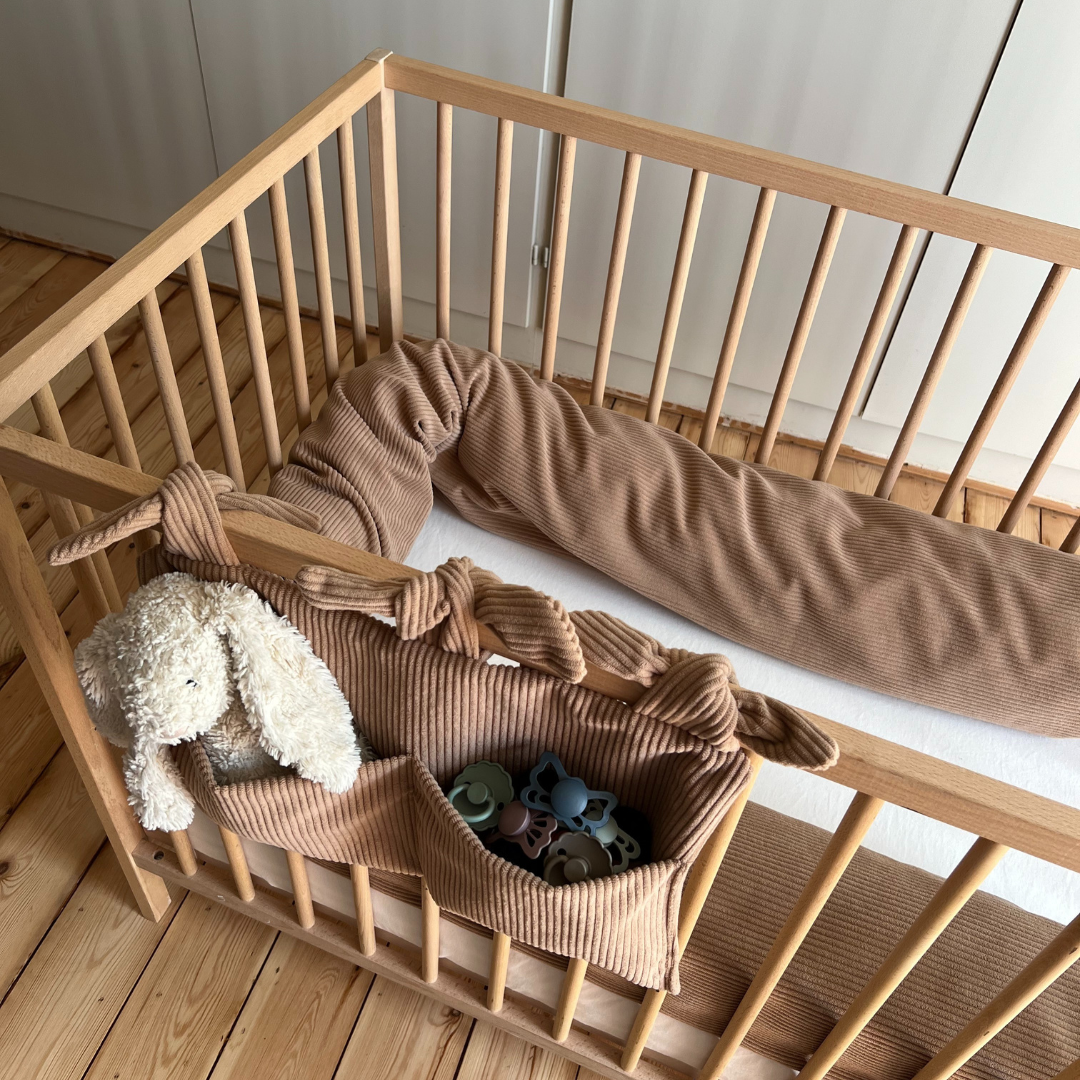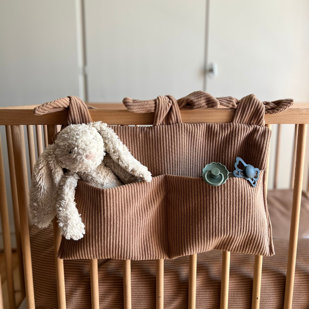 Vi tilføjer en ny, blød opbevaringsløsning i matchende fløjl til tremmesengen, så nusseklud, sutter og så videre er lige inden for rækkevidde, selv i de mørke nattetimer. Lommen bindes fast til sengen og fuldender det luksuriøse og matchende sovemiljø.