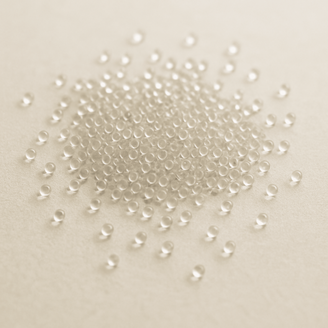 Vi bruger fine, små glasperler som vægt i vores tyngdeprodukter. Glasperlerne er støjsvage, allergivenlige og næsten ikke til at få øje på. De giver en behagelig, jævn tyngde, der understøtter kroppens behov for tryk og omkransning.