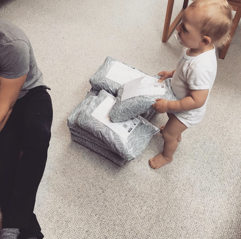 Efter to års udvikling er de første tyngdedyner på lager hjemme i kælderen, og vi kan endelig åbne webshoppen under navnet Babydynen.