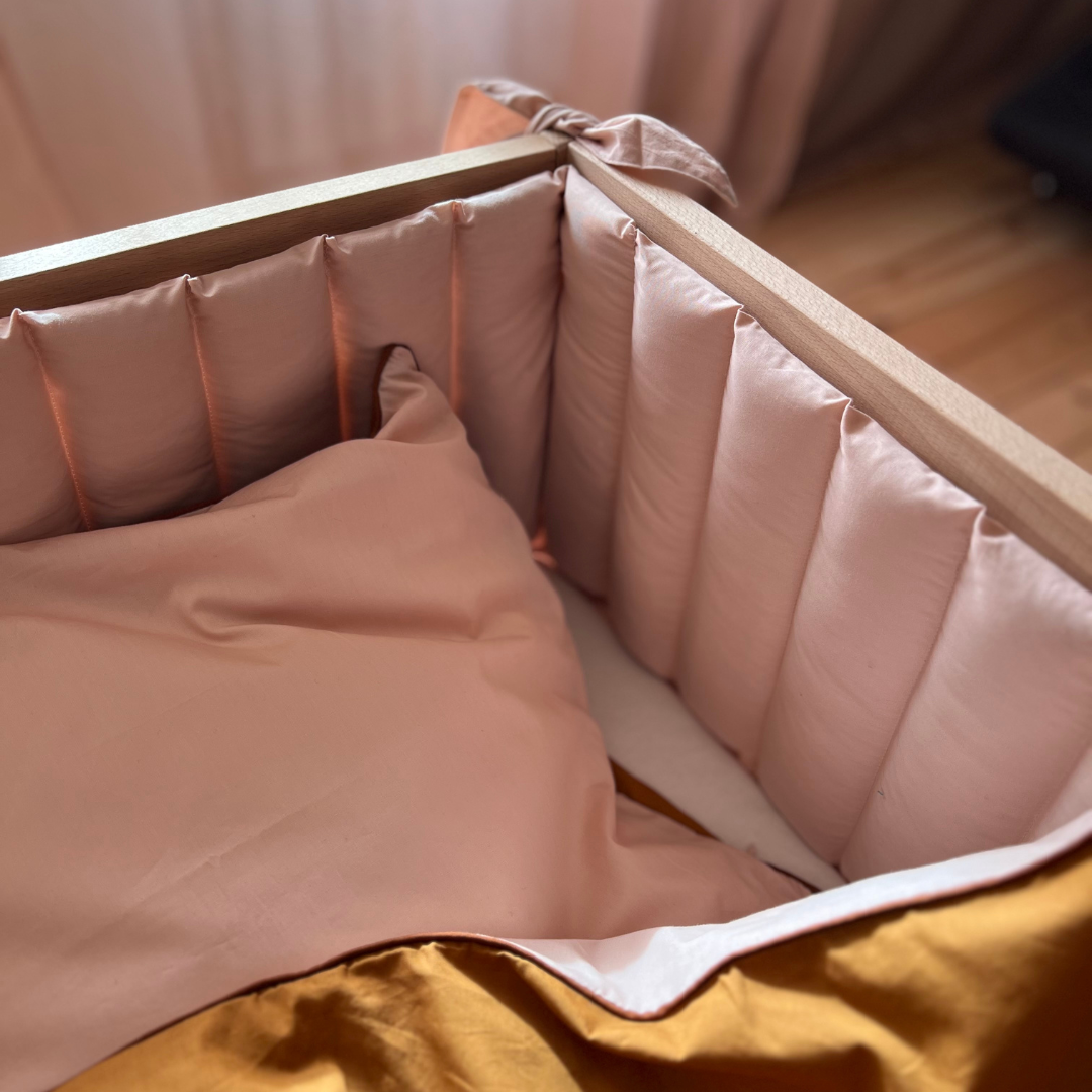 Vi tilføjer en ny, blød opbevaringsløsning i matchende fløjl til tremmesengen, så nusseklud, sutter og så videre er lige inden for rækkevidde, selv i de mørke nattetimer. Lommen bindes fast til sengen og fuldender det luksuriøse og matchende sovemiljø.