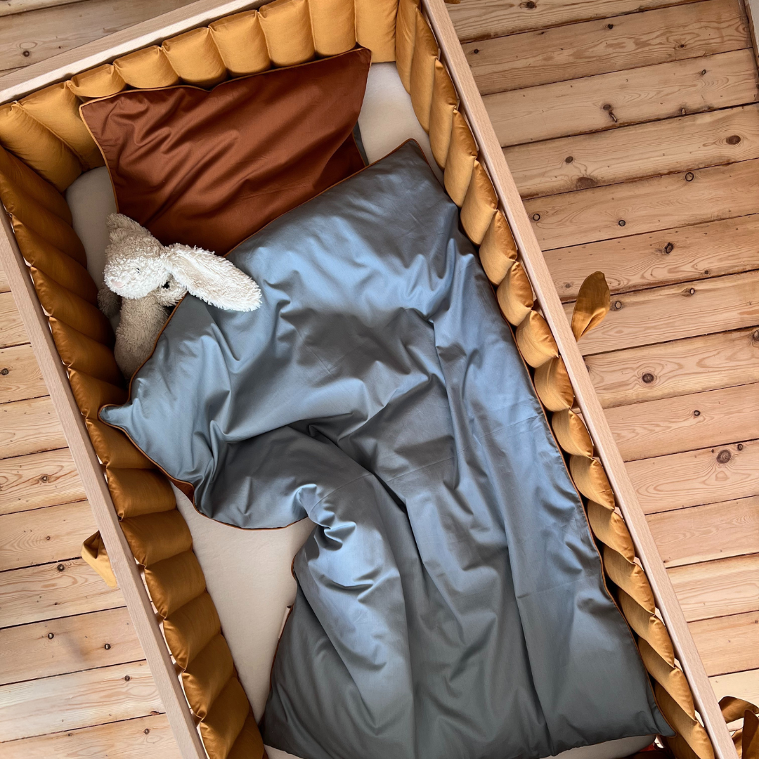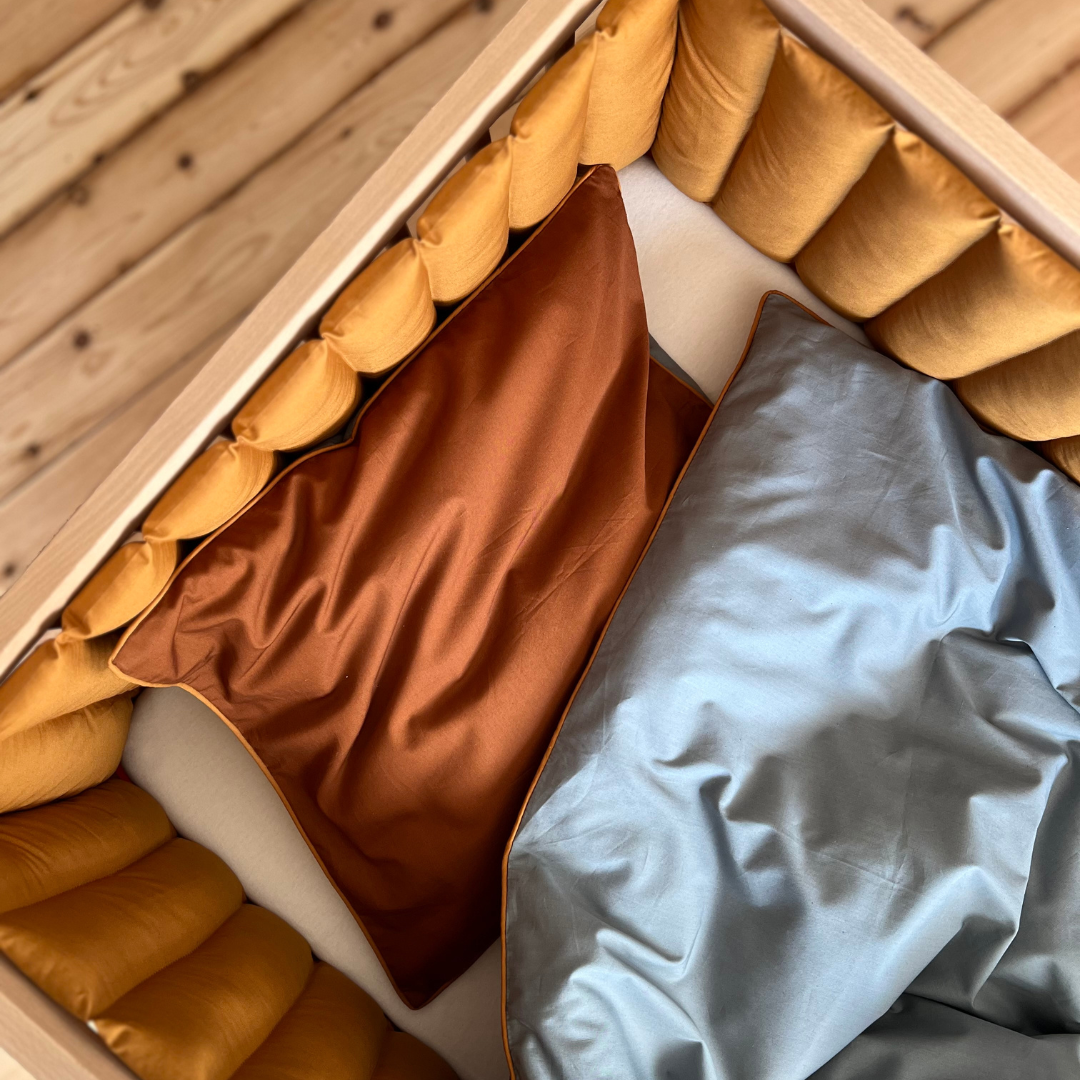 Samtidig er Kapokfibrene fri for fugt og husstøvmider, hvilket gør det helt ideelt til et sundt sovemiljø. Men udover at skabe et sundt sovemiljø, er vores sengerand også med til at skabe et trygt sted at sove, for de helt små. En ekstra detalje, som adskiller vores sengerand fra andre sengerande på markedet, er nemlig et ekstra panel af tekstil, som foldes omkring madrassen. Dette sikrer, at små arme og ben ikke kan komme imellem tremmerne, hvilket ikke kun giver ro i puttesituationen, men også giver mor og far ro i maven, velvidende at deres mindste guld sover trygt og sikkert.